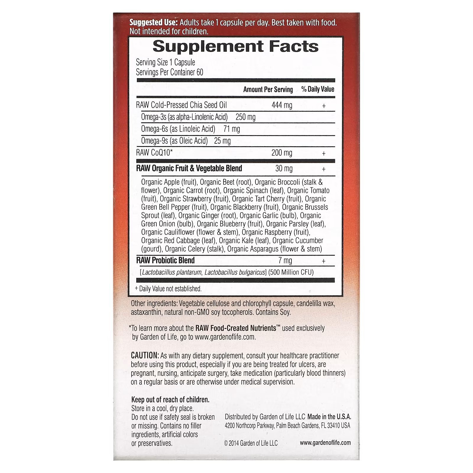 Garden of Life RAW COQ10™ is a powerful formula that delivers 200mg of RAW COQ10 per serving. Fat soluble RAW CoQ10 features a unique lipid delivery system-a RAW cold-pressed chia seed oil omega 3-6-9 matrix-for absorption.